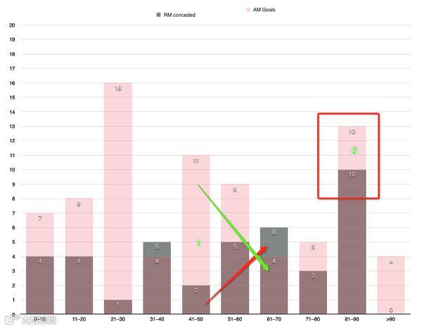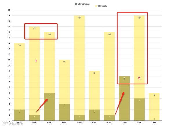 皇马的进球时间配上马竞的失球时间来看,皇马有两个重要的机会,分别是 20 分钟时,马竞第一次失球效率上升和前面提到的马竞体力陷阱的 80 分钟。之前赛季中唯一一次打破马竞大门的是 9 分钟,本泽马。