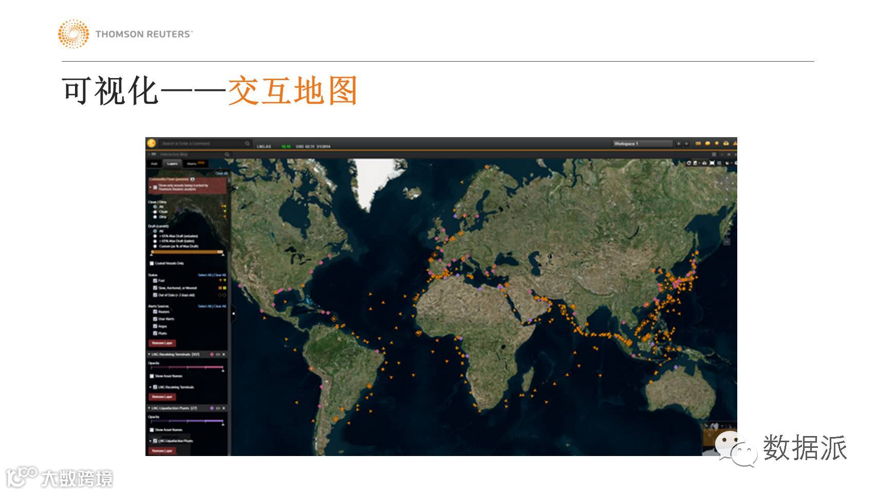 可视化,上图是EIKON的另一个APP,交互图。我们购买了全球所有船只的GDP信号,可以看到运输石油的油轮把石油从波斯湾,或者是英国运到中国,中国附近油轮的密度是非常非常大的,因为中国工业发展最强劲的时候,需要大量的石油,汽车、发电和炼钢等等。