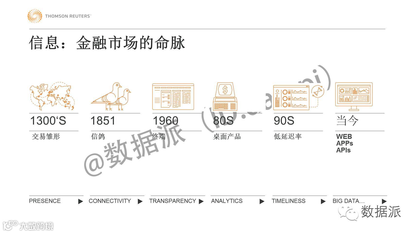 从信鸽到互联网以及最新的云、大数据的技术,越来越先进的数据传输工具使得我们能够把金融信息越来越及时地传送到用户手中。