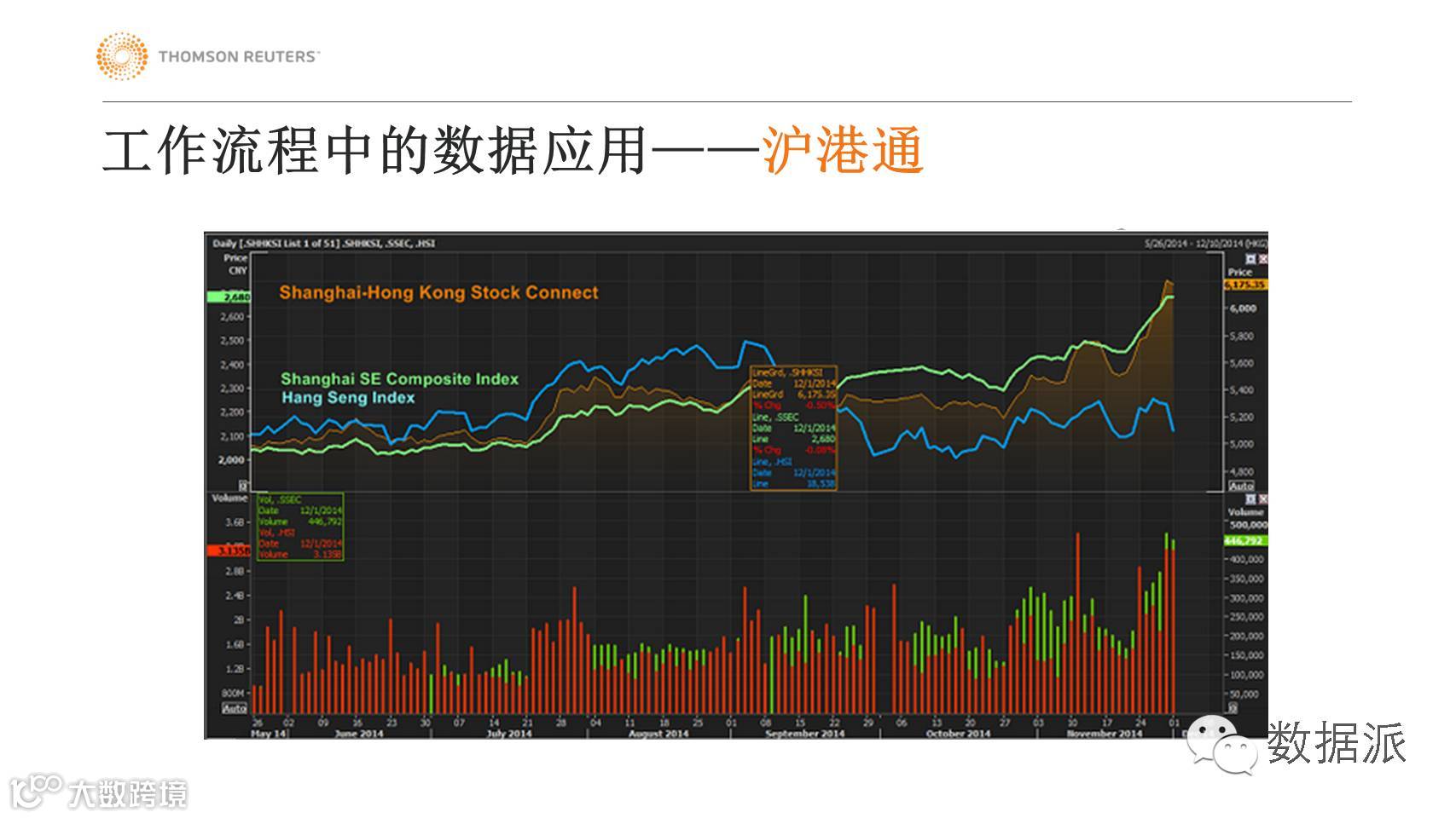 我们在旗舰产品EIKON当中有一个应用叫“沪港通”,帮助香港的用户看到A股的股价,中国的股价是下午三点就闭市,香港是下午四点半闭市,很多投资者可以靠这个套到利差,另外香港有一些股指期货的金融衍生品可以做空,通过上下午的股价可以做很多。再就是利用过去数据做回归分析,因为时间有限,我就不细讲了。
