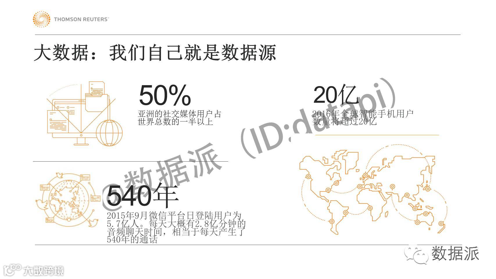 我们通常从专业的报告拿过来一些数据,后来发现社交媒体上的数据不是通过传统手段能够收集到的,再有,最终用户可能不只依赖于传统终端,很多很多用户更依赖于像智能手机这样的终端。另外大家对信息,花时间看的网页和花时间看的手机端差距很大,而且我们自己已经成了大数据的数据源。比如亚洲社交媒体用户数量占全球社交媒体用户数量的一半以上,2015年9月微信每天产生的音频聊天数据相当于540年的电话通话,相关预测到2016年底全球智能手机用户将超过20亿。