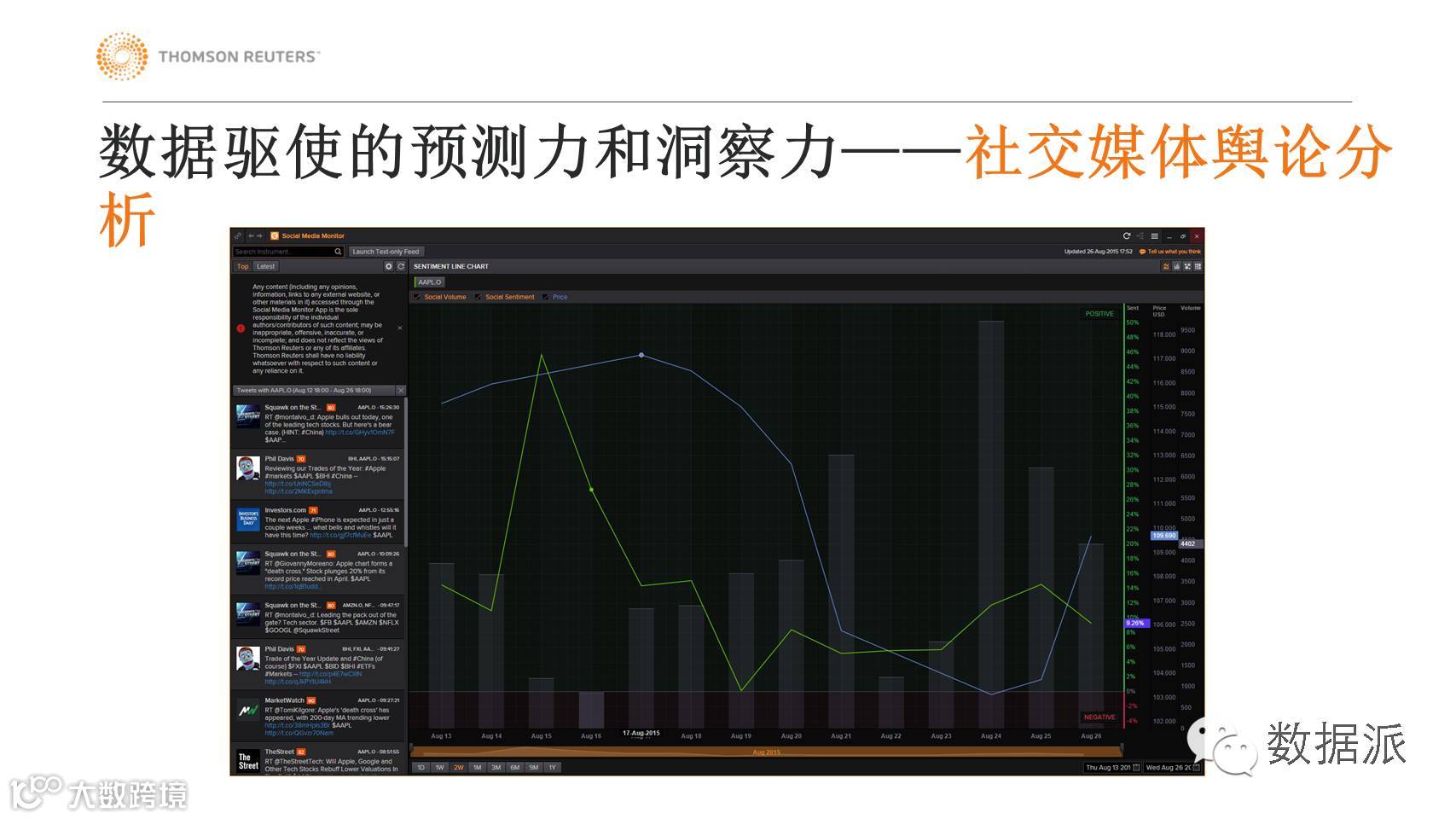 这个大会其中一个主题词是讲“跨界”,当我接受邀请的时候,大会让我来讲跨界,汤森路透怎么跨界呢?其实这家公司开始建立之初就是做数据处理,提供信息的,新闻只是他其中的一类数据而已,刚刚这个视频给大家介绍了我们公司的主要四个事业部。我们最大的事业部是金融与风险事业部。所以今天我的话题就以金融信息为例。