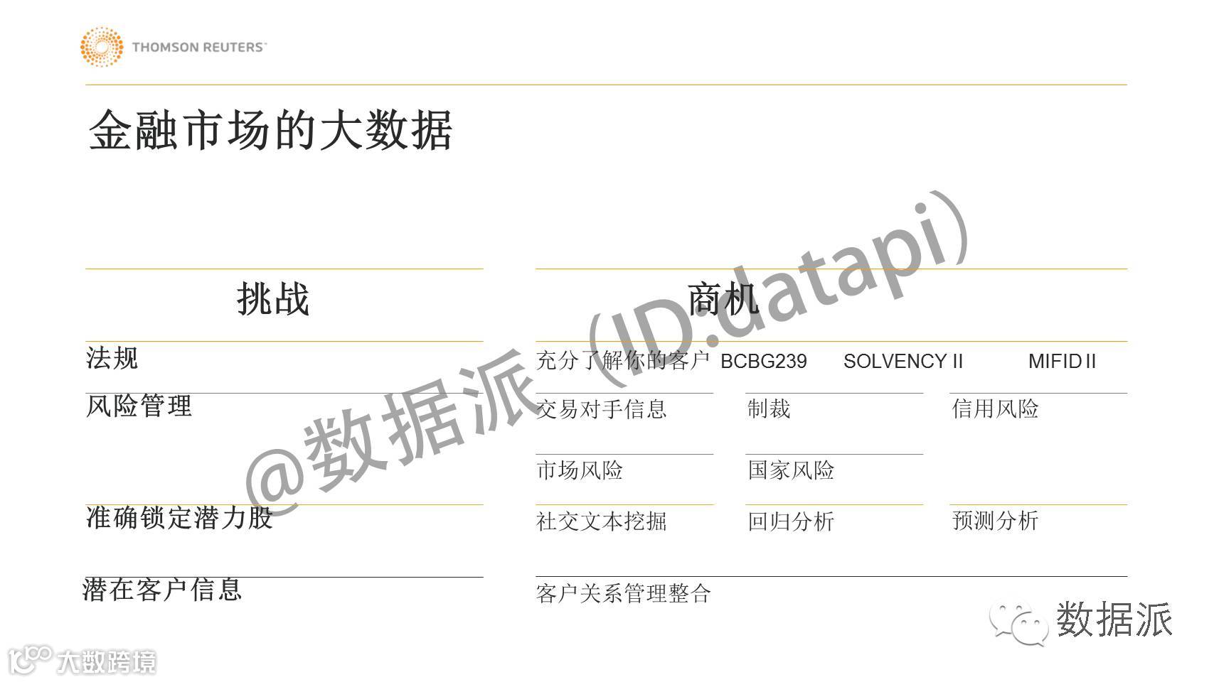 金融市场方面,金融市场占了我们公司一半以上的收入,我们看到越来越多的挑战和商机。挑战来自于不断变化的法规,就像大家可能知道熔断机制不到一个星期就变了。现在还有一个说法——你并不知道你还不知道什么。越来越多的杂音让你很难再用以前的方法去发现前因后果。再有就是如何利用大数据准确锁定潜力股,根据客户信息,有效地整合客户关系。