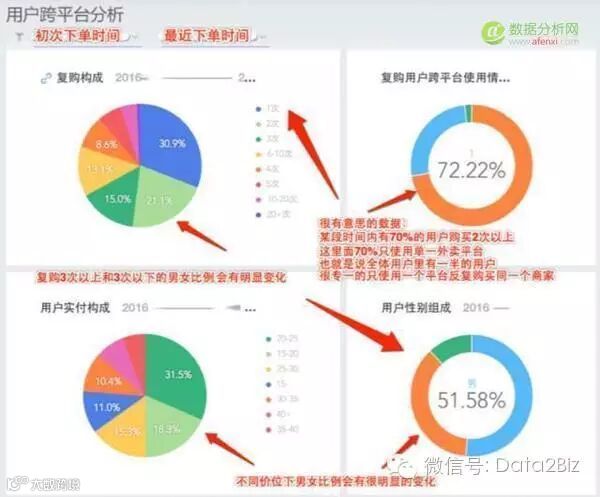 类似的用户数据挖掘,还可以根据复购构成、复购用户跨平台使用情况、性别组成做更精细化的分析。