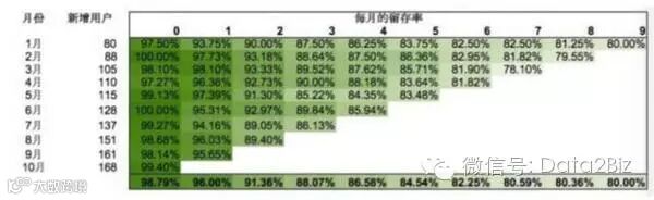 横向比较这个表格,可以看出每月新增用户在后续个月的留存率情况。
