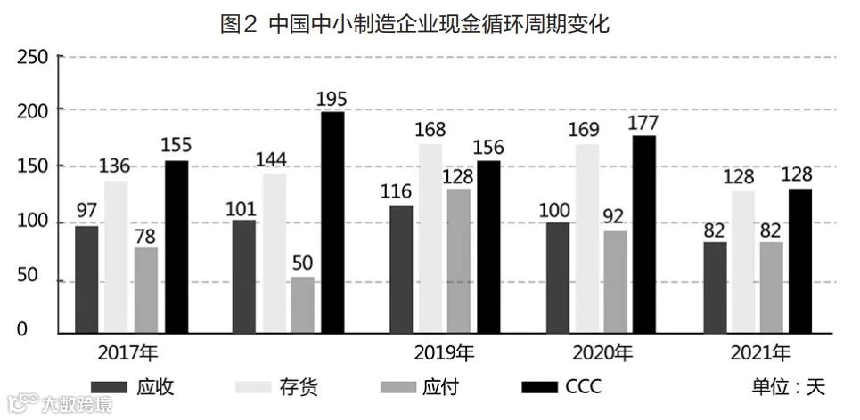 从以上数据和发展态势看,供应链金融这些年取得了长足进步。但与此同时,我们也要看到其持续发展面临的障碍,主要表现在:第一,应收账款和存货高昂,资金流动不畅是当前实体经济发展中面临的重要问题。根据国家统计局数据,2021年,我国规模以上工业企业应收账款总计18.87万亿元,比上一年增长13.3%;产成品存货5.40万亿元,增长17.1%,且呈现增长趋势(见图1)。第二,供应链金融尚未从根本上解决中小微企业运营资金短缺状况,甚至在新冠肺炎疫情的冲击下,资金困境愈发凸显。从现金循环周期指标看(见图2),以中小板制造企业为例,2017年为155天,2018年为195天,2019年为156天,2020年为177天,2021年为128天。第三,供应链金融领域违约和欺诈事件频繁发生,这一现象无疑说明供应链金融的运行以及监管方面仍然存在很多亟待解决的问题。