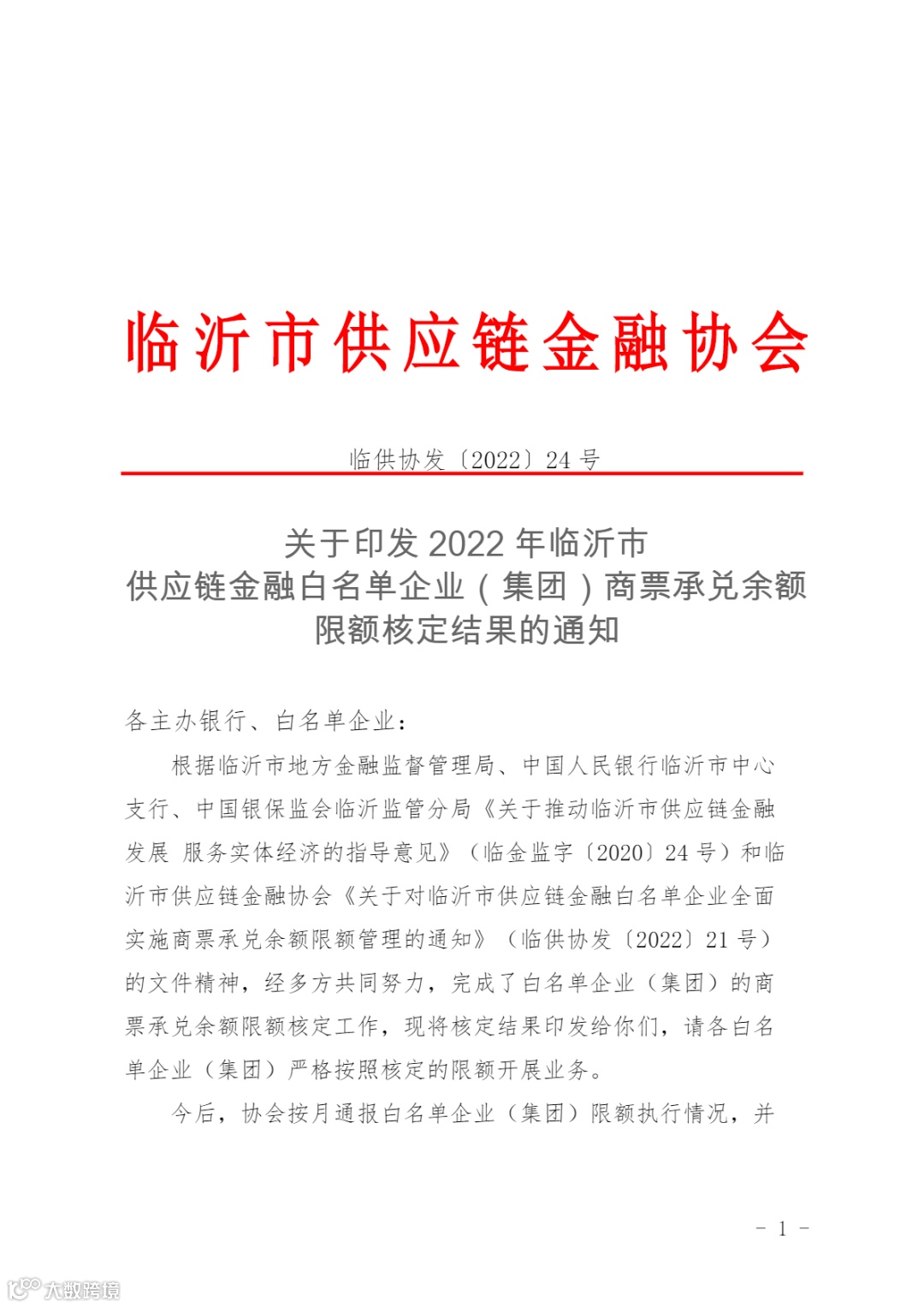 关于印发 2022 年临沂市供应链金融白名单企业(集团)商票承兑余额限额核定结果的通知
