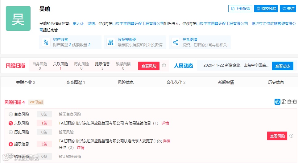 3.通过企查查发现相关法人、高管与前段时间的疑似假票企业-临沂东汇供应链管理公司存在关联关系;
