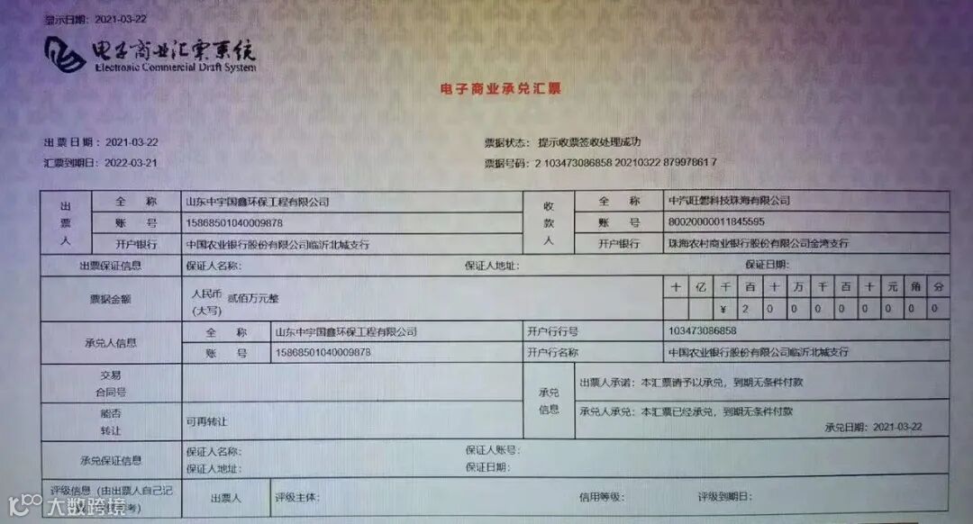 接到举报,一张出票人为山东中宇国鑫环保工程有限公司的电子商业承兑汇票疑似为假票,经核实该企业不是白名单企业,相关情况我会正在落实中,请大家遇到该企业的商票后引起重视!同时建议相关开户银行谨慎开通该账户商业承兑汇票的签发功能。