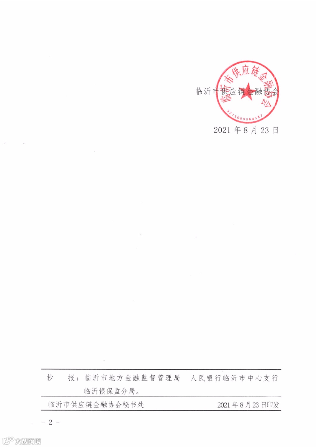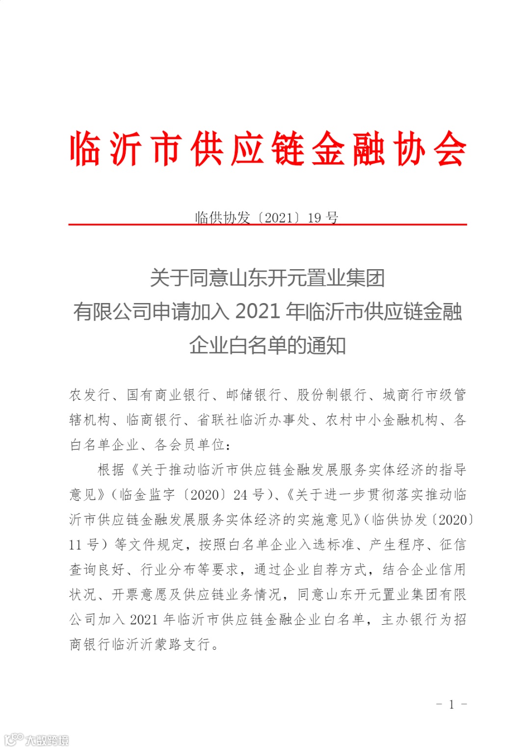 关于同意山东开元置业集团有限公司申请加入2021年临沂市供应链金融企业白名单的通知