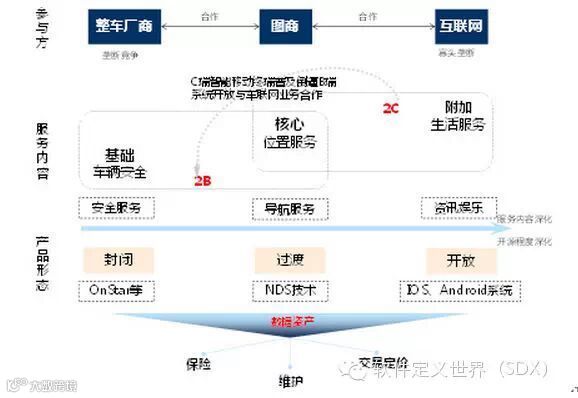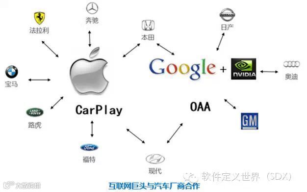 目前以传统汽车厂商为中心的封闭车联网系统和以科技巨头为中心联手汽车厂商的开放平台是车联网发展的种形式。以厂商为中心的车载系统包括诸如通用On Star、丰田G-Book、宝马的iDrive、福特的SYNC、上汽inkaNet、长安InCall等,这部分以车为主的车联网起步较早已经有10多年的发展历史,特点是厂商的封闭系统注重安全服务。近几年,互联网巨头也开始涉足车联网如谷歌的OAA以及苹果的CarPlay,他们将车载系统与智能手机结合,在开放系统上联合汽车厂商提供车载娱乐等服务。