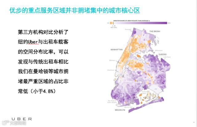 我们对我们服务的区域也进行了分析,在纽约市进行了分析。纽约最拥堵的区域是曼哈顿,我们和传统出租车接单的比例是1:20,也就是说有在纽约最拥堵的地段,每一单优步的行程对应会有20单出租车的接单量,因此我们可以看到我们最核心区域道路占比非常低的。另外在皇后区、布鲁克林区等非核心区域,优步会比出租车多,因为出租车不愿意往那边跑,优步正好是对这方面的补充。