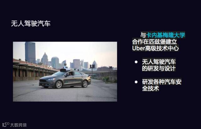 再说说未来,我们是一家数据公司,我们是一家互联网公司,我们是一家由科技驱动的公司。随着科技技术的不断发展,我们的业务也会有新的拓展。首先我们一直在深入研究无人驾驶技术,我们也和卡内基梅隆大学合作成立优步高级技术中心,来研发与设计无人驾驶汽车,同时也为无人驾驶汽车提供安全技术方面的保障和研究。