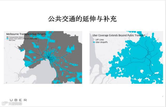 另外看一下优步与传统城市交通行业是什么样的关系,是怎么样融合的。我们通过大数据做了一些分析,首先左边那张图是墨尔本,黑色的线是轨道交通网络,而我们看到蓝色区域是轨道交通和常规硅胶所能覆盖的公共区域,灰色的区域就是没有任何公共交通服务的,我们叫公交沙漠。右边那张图,我们优步所能提供的服务的区域,是不局限于地铁站周边的,全市范围的服务,应该说是对公共交通的延伸和补充。