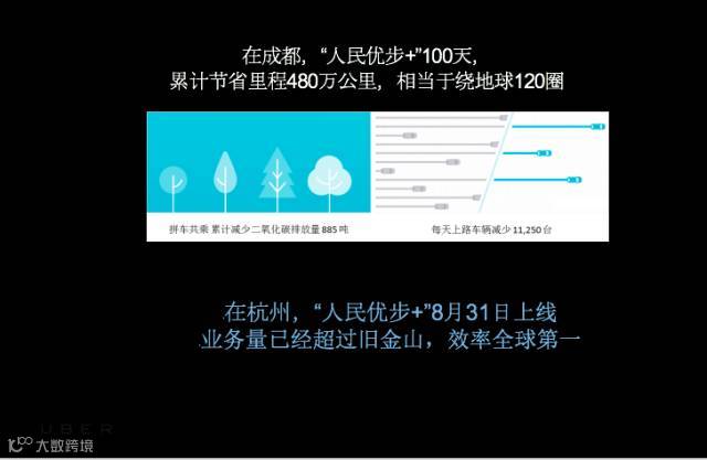 我们对拼车产品的节能减排的效果进行了定量的分析,比如说我们在成都,“人民优步+”上线100天之后,对所有的拼车旅程进行了统计,累计节省里程480万公里,相当于绕地球120圈,然后我们折算出减少的二氧化碳,我们发现减少二氧化碳排放量超过了835吨。同时因为拼车的出现,也减少了我们现在已有车辆上路的方式,减少了一万多辆车的上路。