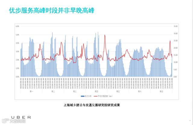 另外对专车或者拼车,社会上有一些争议。是不是专车出现之后增加了城市的拥堵,我们也用大数据做了一些分析。比如说在上海,我们和上海城乡建设与交通发展研究院做了一项研究,一个是上班早晚高峰的拥堵,另外就是区域的拥堵。从时间上看,发现一个非常有意思的事情,是优步服务的高峰期并不早晚高峰,第一个高峰是深夜凌晨两点到凌晨四点,因为我们的用户很多都是一些年轻人,比如说在KTV、酒吧进行了消费娱乐之后要回家,在这个时段所有的公共交通已经停止运营,出租车又处于供给比较少的状态。另外我们很多消费者喝过酒又不能自驾回家,所以这是我们专车服务的高峰期。还有一个高峰期是在早上十点到下午的两点,这个时间段其实是商务出行的高峰,所以优步可能更偏于商务人群。
