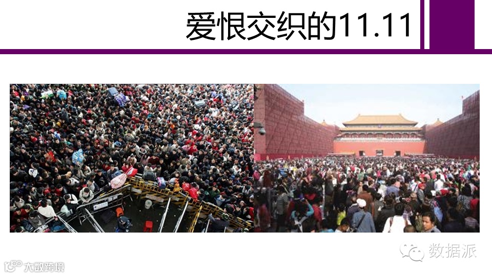 在座的有谁11.11的时候参加过“剁手党”,买过东西?双十一让我们爱恨交加。我们来看这两张图,一张是春运,一张是十一黄金周。
