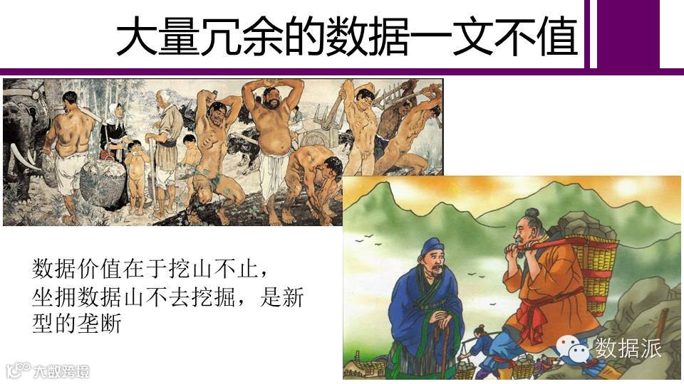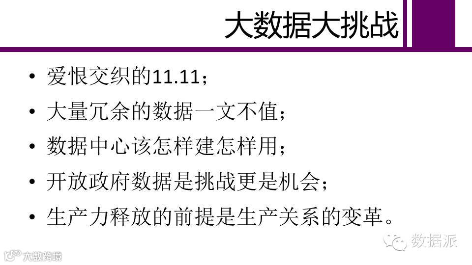 第二个挑战是现在做大数据的产生了大量的冗余数据。我之前跟很多人聊过,过去“愚公移山”说的是愚公每天挖山不止,挖一点就会少一点。大数据时代可以改写“愚公移山”这个成语,可以写成新“愚公移山”。因为数据山不一样,你从这边可以刨出金子,那边可以出银子,再从另外一边可以刨出其它有价值的东西。而且山还在,还可能会越长越高。今天我想提出另外一个思考的角度,在座的各位手上是不是都有跟别人几乎一样的数据?每个人都从网上扒一大堆数据,每个人都存了一大堆别人那里也有的数据,这个其实是在拷问我们自己。用着方便固然是个理由,但是大量数据冗余造成社会资源浪费?有些时候我们觉得我们花了钱了就有理由浪费,或者别人没出钱,不能管我。浪费就是浪费,没有任何意义。所以我们有没有可能把大家共用的数据放在一个地方,让大家随时可以用。如果遇到智叟忽悠愚公每天堆山不止的话,那是坑你呢。数据在于“挖山不止”,在于利用。包括现在很多政府的数据没有充分利用,都是一种浪费。