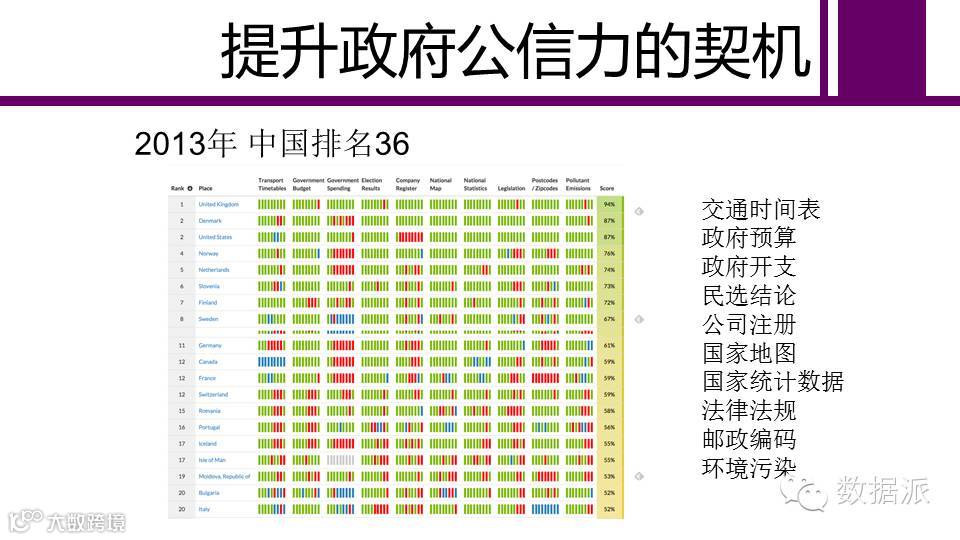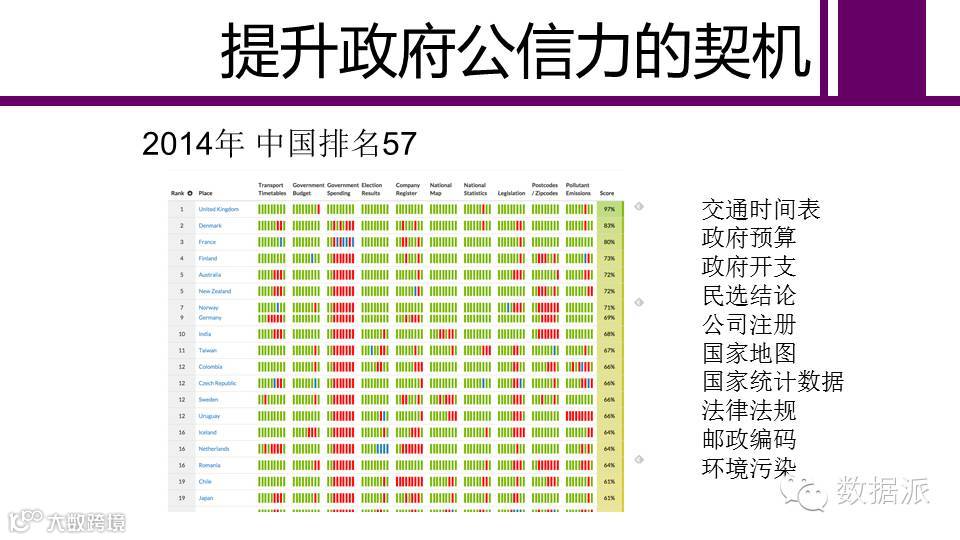 政府开放数据是政府重塑公信力的机会,但也面临挑战。这张表的指数体系是英国做的。他列出了作为政府开放数据,应该包含哪些标志性的指标(政府预算,政府支出,等等)。这里面名列第一的是英国政府。我在英国伦敦市政厅的网站上发现,他们把单笔超过250英磅的政府开支全部向公民开放。我们国家现在有一些地方把政府预算能够公布出来,但是支出公布还做不到。这方面的政府数据开放其实是考验我们的执政自信力,我们要告诉老百姓钱花在哪儿了,让老百姓监督。