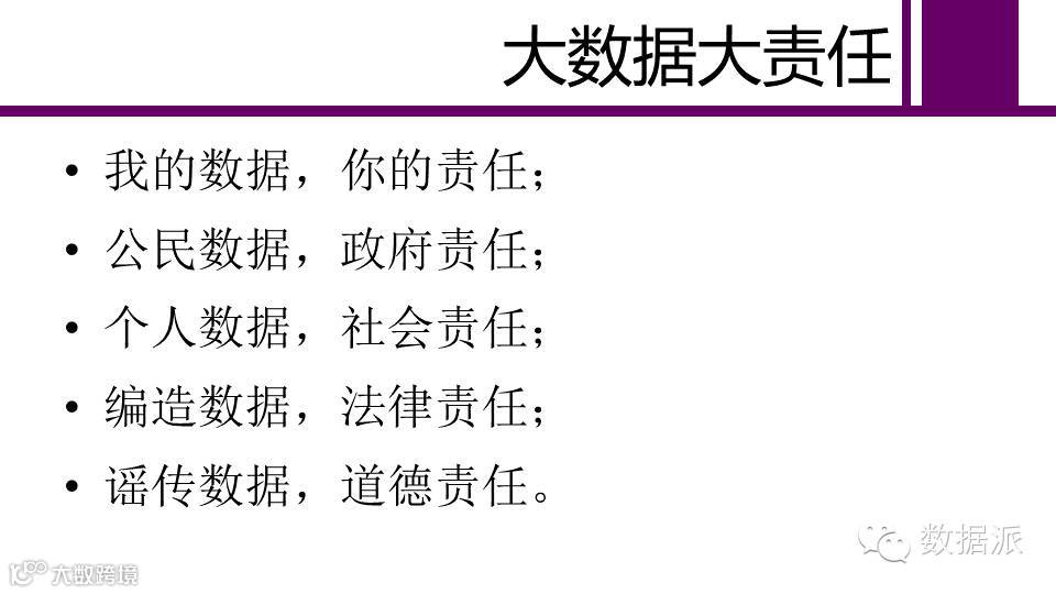 大数据今天是件比较“高大上”的事情,但是并不代表我们可以任意发展,随意地滥用数据。大数据意味着大挑战大责任。所以我希望今天在座的大数据从业人员。认真想想自己的责任,真的管好用好自己手上的数据。有人问我,我们公司采集的客户数据被黑客攻击而流失,谁的责任?我觉得既然数据是资产,我把我的资产寄放在你那里,就相当于美国有存货的地方。我把东西交给你,你应该为我保存好。你如果没有保存好,你的保安不够格,最好别揽这个活。因为数据被盗,你也许不负法律责任,但也要负民事赔偿责任。