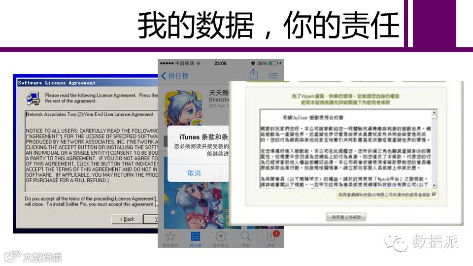 我们每天都会遇到各种各样被迫要点“同意”“接受”的应用,大多数情况下我们也都接受了。如果你是苹果手机,你可能还有一些做其它选择的权利;如果是安卓系统,也许你只有不用或接受全部条款。这个背后,应当隐含着我和数据采集者之间建立的一种契约关系。我的数据给你是因为你可以向我提供特定的个性化的服务。如果你不加说明、不加处理就把我的数据转让给别人,谋求利益,这应该是不合法的。即便是不牟利,也是不合理的。这个我们大家都记在心上,采集别人的数据时你要想好,你要对别人的数据负责任。