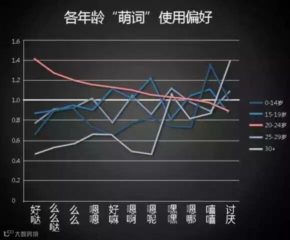数据还显示,20-24岁是“最爱卖萌的年纪”,几乎所有测“萌词”使用频率都高于平均水平(平均水平为1),其中“好哒”的使用频率是平均水平的1.4倍以上,而其他年龄则都在平均水平以下。