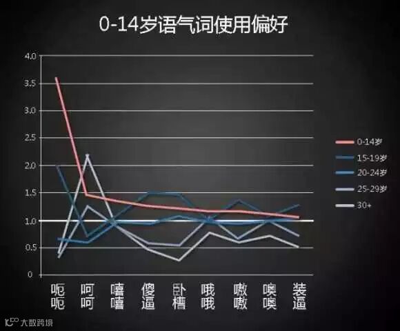 对各年龄段人群语气词使用偏好进行分析后发现,0-14岁的小网民喜欢一些酷酷的词。下图为0-14岁网民使用频率高于平均水平的词语,这些词大都表达一种“无语”的语气,其中“呃呃”的使用更是达到了平均水平的3.6倍。而对于30+的人群来说,除了“呵呵”这些词的使用频率都不高。稍大一些的95后(15-19岁)则和00后有些相似,使用频率都略高于平均水平。别看00后年纪不大,作为互联网“原住民”的他们可是经验不少,逼格不低。