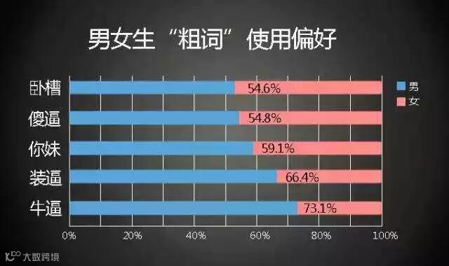 分析了人们最常使用的“粗词”后发现,男生还是爆粗口当之无愧的“主力军”,所有词语的使用都是男生多于女生。其中“牛逼”使用的差异最明显,男生使用的频率是女生的近3倍。