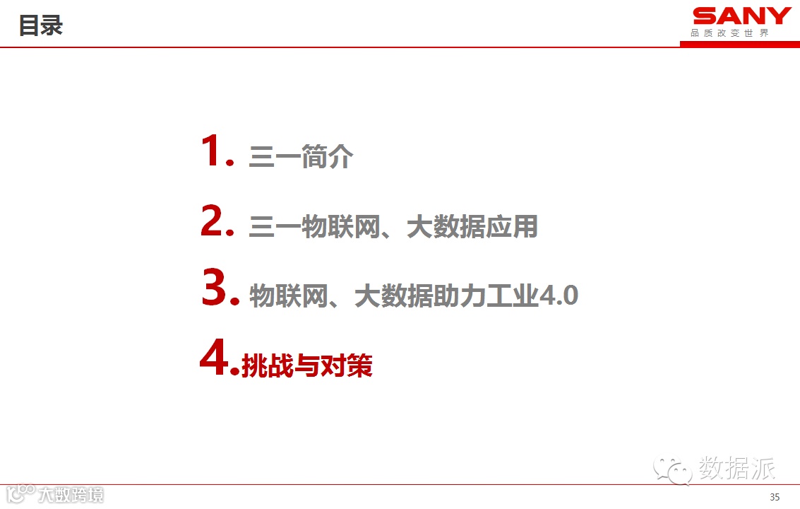 我的题目是《物联网、大数据助力工业4.0》,有这样几部分:第一,三一的简介。第二,应用现状。第三,助力工业4.0。第四,挑战与政策。
