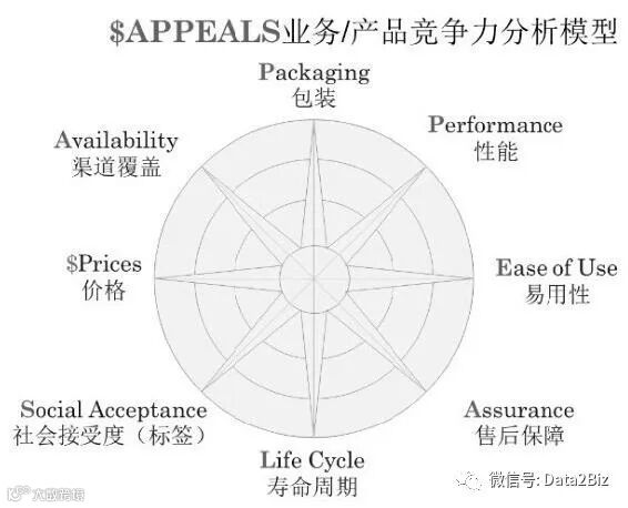 当分类维度超过3个以上时,就需要使用扇形图或者雷达图来表达。比较典型的一个分析模型就是IBM产品竞争力评价模型$APPEALS,如下图所示。