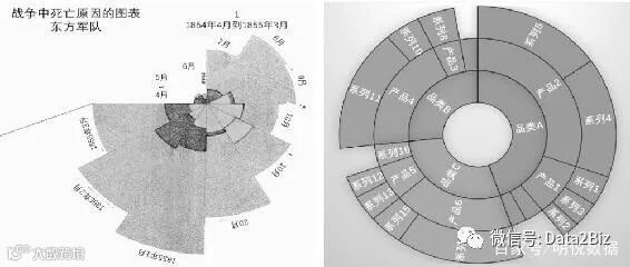 南丁格尔的玫瑰图是饼图的延伸,其将图等分成12份(表示12个月),然后每个部分都代表死亡的士兵数量,根据士兵死亡的原因,分别分成不同的段,从而能够看到哪一种死因占比最大,如下图左图所示。