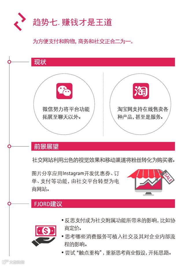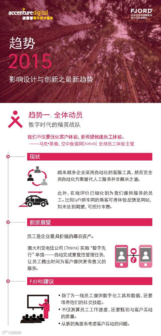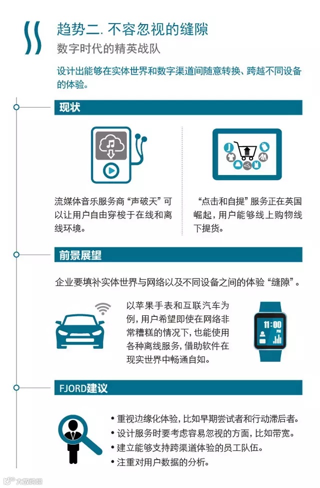 美妆电商Birchbox正兴起“数字排毒期”;俄罗斯和德国政府订购老式打印机以防信息泄露;Evernote和Moleskine合作打造实体“印象笔记”……服务者和使用者都想摆脱一直联网的状态,过上有节制的数字生活——这只是2015及未来数年的九大趋势之一。埃森哲互动营销服务团队Fjord推出《趋势2015》报告,描绘出一张“趋势蓝图”,呈现出未来几年内,在数字时代中我们需要解决的九大问题。
