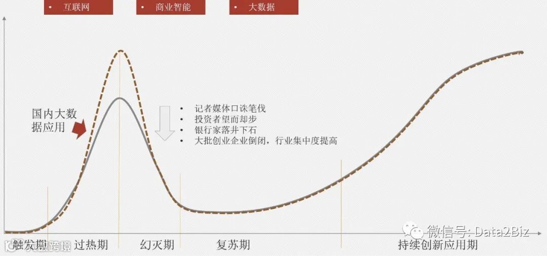 大数据本身是一个新的技术,在这个技术被发现并应用的过程中也会经历曲线发展变化趋势。在触发期,大家对大数据的认知很少,但随着应用案例的不断出现,会有越来越多的人开始呼吁新技术,以至于人人都在谈论大数据,媒体也在炒作,技术领袖也会出来背书。当炒作到一定热度的时候,期望值过高,而技术不成熟,普及难度会增加,很多失败的案例开始涌现,再加上媒体开始发挥其夸大本性,对新生技术口诛笔伐,银行家和投资者也会失去信心,使其进入“幻灭期”。新技术本身都有一个逐步成熟的过程,其价值发挥也需要一定的发酵和酝酿过程。