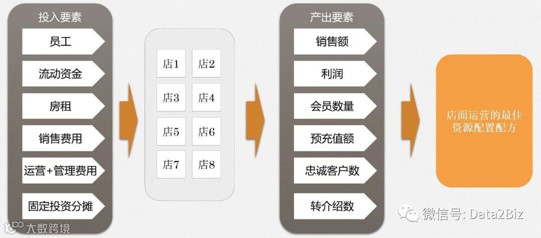 存在多个店面之后,我们可以根据投入要素和产出要素在多个店面的实际情况来构建数学模型,从而评价哪个店面的配方最为合理,由此形成了在统筹学上经常用到的DEA模型,该模型不仅能够根据现在店面的运营状况得出一个相对较好的配方,而且针对每家店面,能够得出哪些要素投入多了,哪些方面投入少了,然后可以优化。