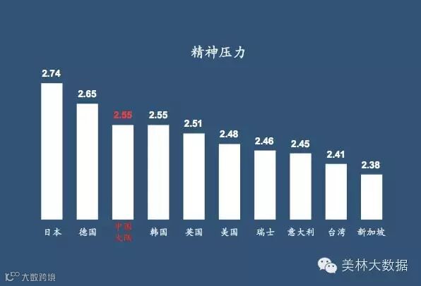 在精神压力方面,两个“处女座”民族——日本和德国——毫无悬念的排名榜首。在工作时保持强大的集中力和专注度,能够提升阐产出的效果和质量,但也会对工作者本人的精神造成较高的压力。