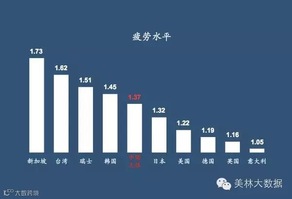 上图是世界上十个国家在疲劳指数上的数据。指数越高意味着越疲劳。中国在这个榜单上排名第五,位置适中。纵观整个榜单,可以发现一个有趣的现象, 东亚文化圈(或说儒家文化圈)的人,整体上要比西方国家更加疲劳——或许跟东方人普遍信奉辛苦工作的人生准则有关系吧!