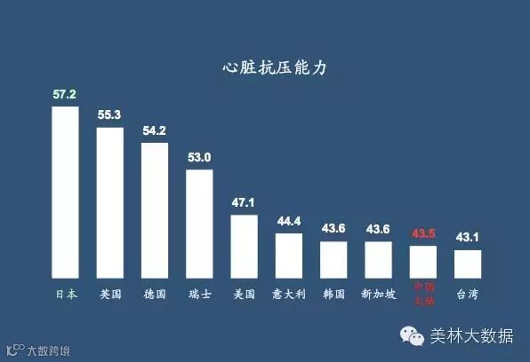 日本人在这项指标上依然雄踞榜首,这也跟事实相吻合——日本是世界上心血管发病率最低的国家之一。这也是他们长寿的另一个重要原因。