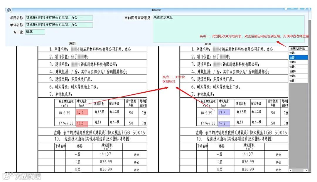 环球软件“数字化审图平台”依托云服务器,将传统的“人带图纸跑”转变为“图纸在云上走”,实现对勘察、建筑、结构、电气、给排水、暖通等专业施工图设计文件“云上一站式”审查,图纸上传、受理、审查不再受时间、空间限制。平台实现了从项目勘察、设计、施工、审批、监管到档案管理的数字化交付、管理全过程留迹、监管有据。为协助施工图审查人员更高效、高质审查,平台实现图纸差异智能比对,依据文字、尺寸、图片像素等进行精准比对,通过对比解析,两版图纸具体修改的部分或差异用色块标识,修改痕迹、审查意见和设计单位修改情况等都保留在系统数据库中,管理部门可随时查看审图情况及设计单位整改情况能够及时发现和处理问题,建设单位、勘察单位、设计单位、审查机构和监管部门之间实现了资源的有效整合、资源数据的共享,为企业降本增效提供强有力的支撑,助力数字化审图业务提质增效再提升。