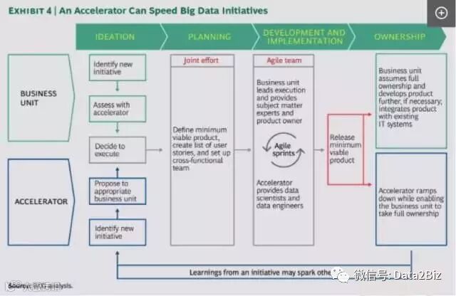 虽然没有业务部门与加速器如何协同工作的标准案例(公司跟公司之间会有所不同),但有一个通用的流程:构思-策划-研发以及部署-ownership。无论是业务部门,还是“加速器”,都能为项目带来关键技能。业务单位提供业务专家和产品所有者; 加速器提供分析专家、数据专家和开发主管。在一起,他们通过频繁的周期来开发、测试与学习构建最小可行性产品。