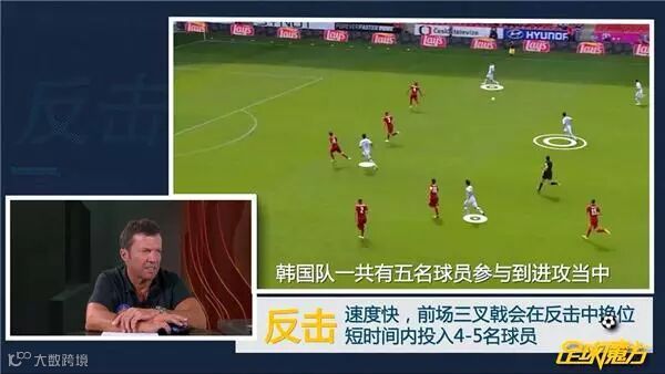 第三,韩国队反击更依赖“进攻中场+边前卫+边后卫”。尽管韩国队的6秒反击极少直接找到前锋,但是防转攻速度很快,前场三叉戟会在反击中换位,反击中会在短时间内投入4-5名球员。马特乌斯也指出,韩国球员身体强壮、有冲劲,且脚下功夫出色,他们重获球权后三至四脚内便能完成攻防转换。因此面对这样的反击战术,对手一般只能回撤防守。