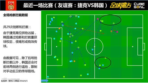防守方面,韩国的整体防守打法讲究中前场边路压迫。中韩上次交手的东亚四强赛一役,中国的第二个丢球就来源于边路被抢断。而面对捷克,韩国队除了正常的后场阵地防守以外,还会对前场两侧进行逼抢施压,限制对手边后卫的传球路线,迫使其回传中后卫,让对手在中路控球。