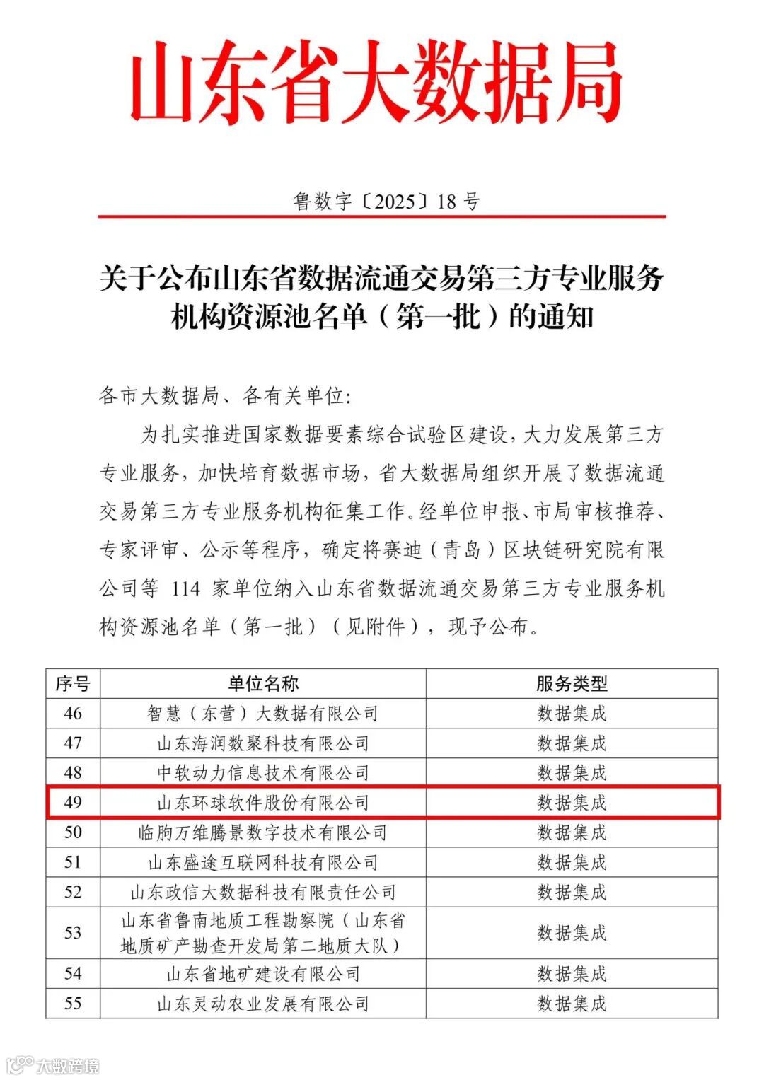 近日,山东省大数据局公布首批数据流通交易第三方专业服务机构资源池名单,环球软件凭借在数据集成、治理及场景应用服务领域的综合能力,通过单位申报、市局审核推荐、专家评审、公示等多环节审核,从全省竞争中脱颖而出,成为114家入池单位之一。此次入选标志着环球软件在数字资产化、要素化、市场化领域探索实践服务中的技术专业性、场景适配性、合规性及服务能力获得官方权威认可。