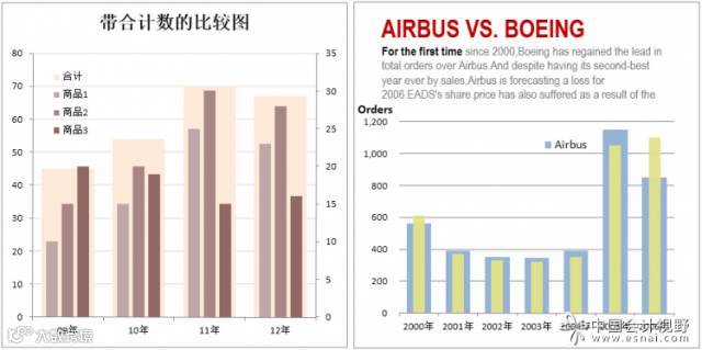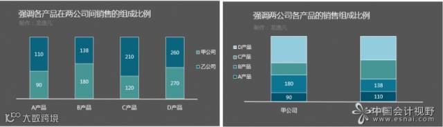 如果要反映总销售额,还要体现具体构成,则可使用累积柱形图,并且侧重点不同,要使用不同的角度。比如左图是强调各产品的销售收入,同时体现了在各公司的销售构成,右图则是首先体现了各公司的销售收入总额,同时体现了各产品的销售构成。