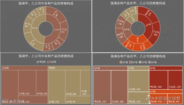 比如同样是使用上面表格的数据,下面的二图都能反映甲乙公司各产品的销售对比,但侧重点不一样,左图是强调甲乙公司内部各产品的销售对比,而右图是强调各类产品的销售对比。