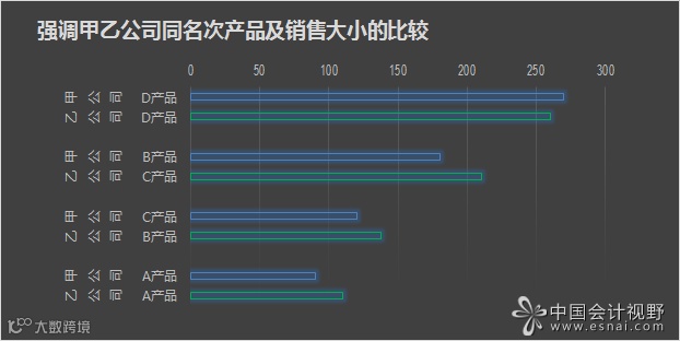 如果使用下面的滑珠图,则综合了上面二图的优点,既可反映甲乙公司各产品的销售金额大小,也方便对同一产品进行对比。