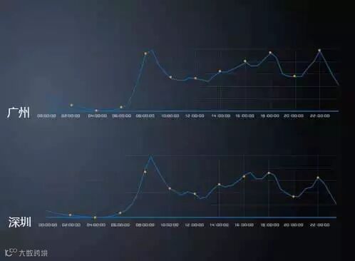 数据显示,上海只有上午9:00出现一次早高峰,没有晚高峰和夜高峰,也说明上海人比较享受生活,而非工作。广州和深圳的出行波峰走向非常一致,下午高峰和晚高峰峰值也基本相同。而在北京,一天中三次高峰非常明显,夜高峰的订单量远远高于早高峰和晚高峰,加班到深夜才回家的人是上班族的大多数。