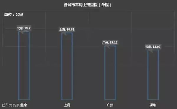 北京城市面积最大,人均上班里程也最长,为19.2公里;其次为上海18.82公里;广州和深圳平均就要短一些,分别为15.16公里和13.97公里。拿北京而言,翻山越岭中关村,望眼欲穿CBD都不算事,光是上班路上就得非常拼。