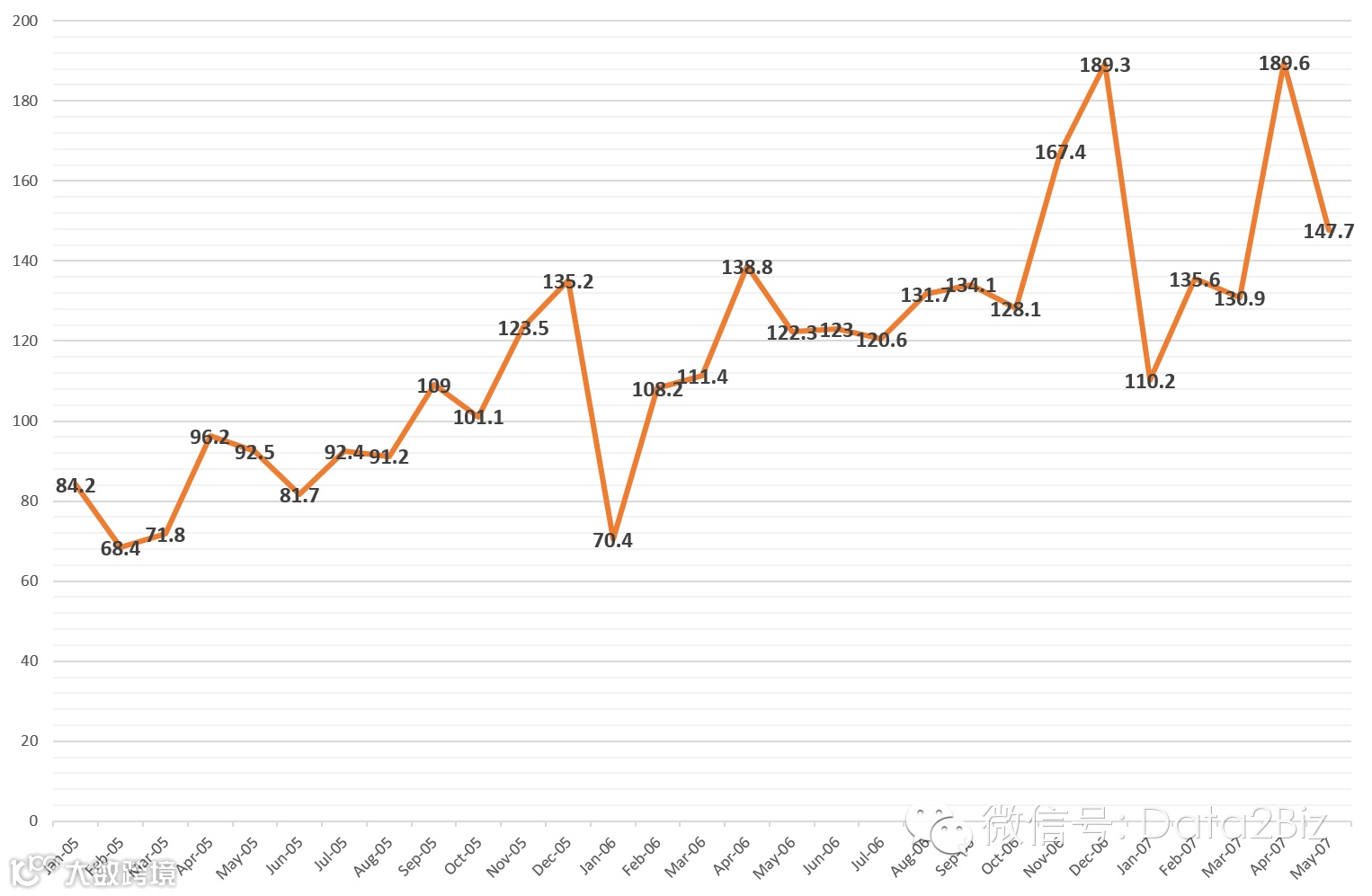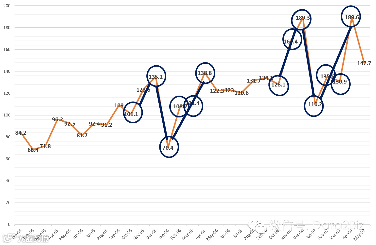这是一家快速消费品公司的销售额月度变化曲线图。从这张图上我们可以看出曲线的变化特征: