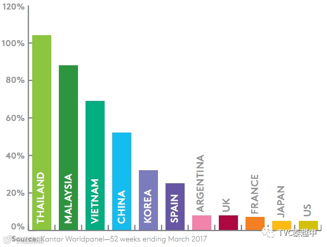 根据 Kantar Worldpanel数据,越南、泰国和马来西亚的电商境界在2017年3月之前的一年内创造的收入总体增长了30%。