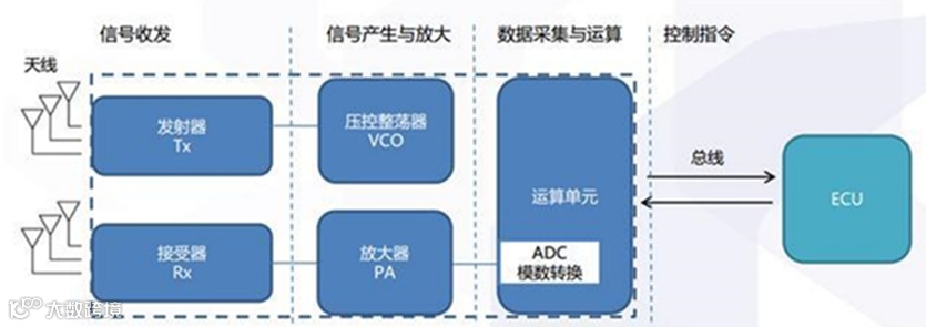 毫米波雷达上游主要由雷达射频前端(MMIC)、天线系统(高频PCB系统)、基带数字信号处理芯片三个核心部件构成,结合后端算法构成完整的毫米波雷达模块。